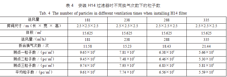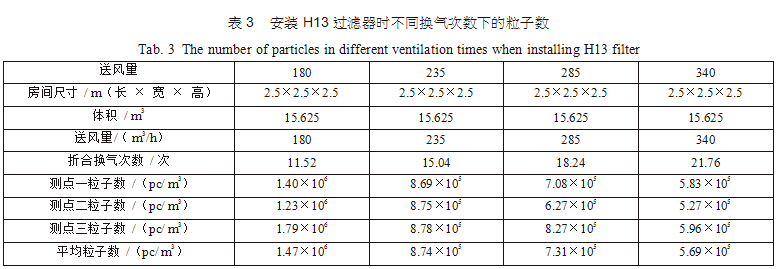 在空調(diào)機房中新建了三間2.5m×2.5m×2.5m的潔凈間,從空調(diào)主風管引風,每支支管設置調(diào)節(jié) 閥,并設排風機進行全排,送回風口及測點布置分別如圖 3(每點取樣三次,取平均值)??紤]到初中效過濾器對最后潔凈度的影響和最后理論塵埃數(shù)量 計算的方便,試驗用初中效繼續(xù)分別為G4、F8,三個房間分別安裝高效過濾器,風量500m3/h,第一組數(shù)據(jù)為送風量按GMP 驗證指南推薦換氣次數(shù)保持不變,分別用H12、H13、H14、U15過濾器,第二組數(shù)據(jù)為采用H13高效過濾器,調(diào)節(jié)風量 ;第三組數(shù)據(jù)為采用H14高效過濾器,調(diào)節(jié)風量,分別測得塵埃粒子數(shù),并列表得出不同的換氣次數(shù)下對應的塵埃數(shù)如表2、表3、表4。